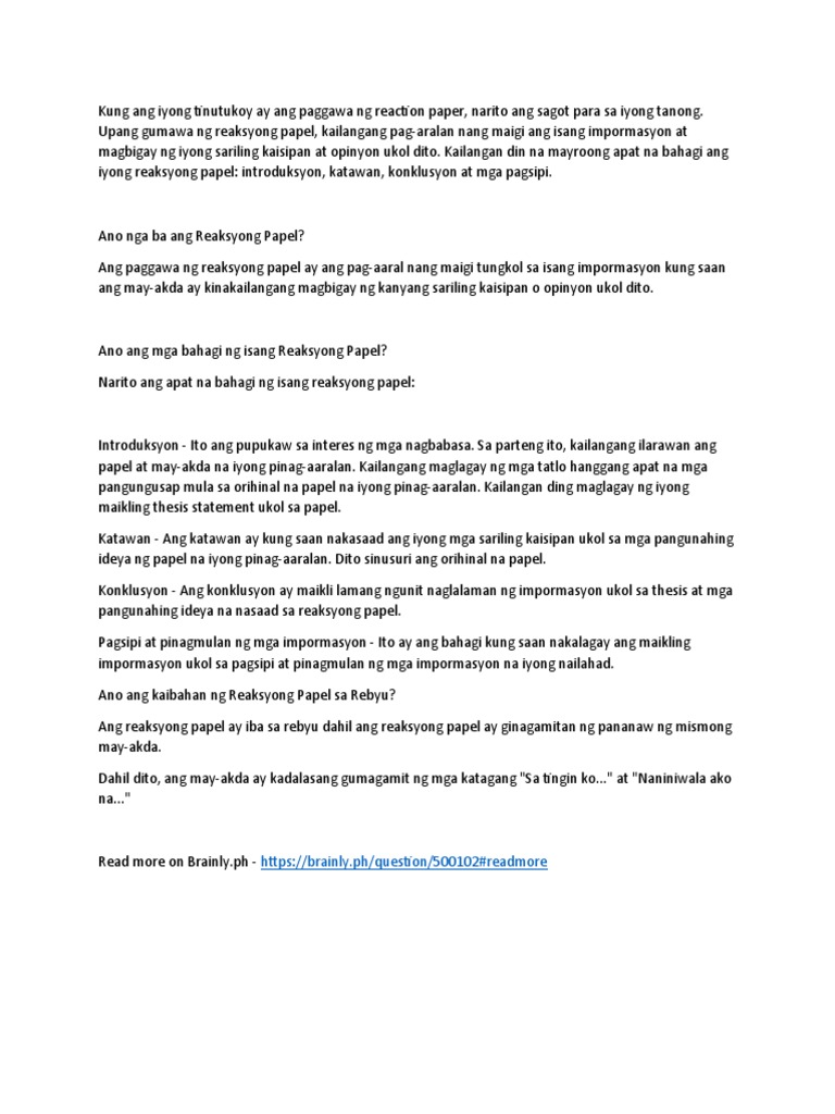 3 question Ano ano ang mga pamamaraan sa pagsulat ng reaksyong papel. Kawalan Kapalit ng Kaunlaran Pamantayan sa Pagmamarka Rubriks Reaksyong-Papel Blg. February 22 2020 Modified date.