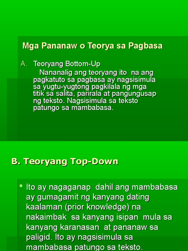 Binibigyang pansin ang salita sa halip ang mahalagang mensahe B. Inilalarawan ng mga teorya sa pagbabasa kung paano mapapabuti ang pag-unawa sa isang pagbabasa. Ito ay bunga ng teoryang behaviorist na higit na nagbibigay pokus sa kapaligiran sa paglinang ng komprehension sa pagbasa.