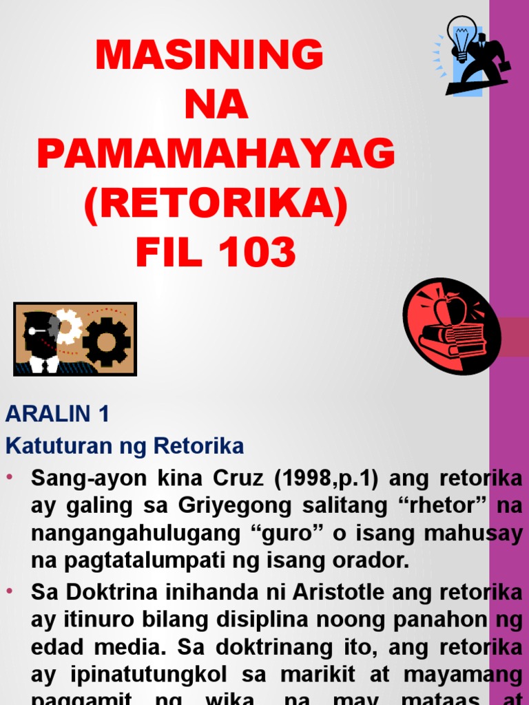 Karamihan sa mga mambabasa ng isang salin ay sinusuri ng buong husay ang isang akdang salin bago nila ito basahin. Kahulugan at Kalikasan Kung babalikan natin ang pagbibigay ng kahulugan sa retorika mababatid nating ito at ay bahagi ng edukasyon sa malayang sining ng panahon ng medieval at nakatoon sa paggamit ng wika uapang magbigay ng panuto at manghimok. Nakagagawa ng isang masining na pagsulat.