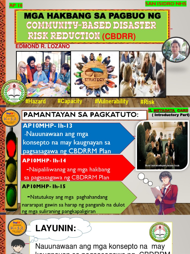 10 araling panlipunan unang markahan modyul mga hakbang sa pagbuo ng disaster risk reduction and management plan araling panlipunan ikasampung. Nakatuon ang modyul na ito sa Aralin 5 na tutukoy sa Mga Hakbang sa Pagbuo ng Community Based Disaster Risk Reduction and Management Plan. 982017 Ito ay isinasagawa sa lokal pambansa rehiyunal at pandaigdigang.