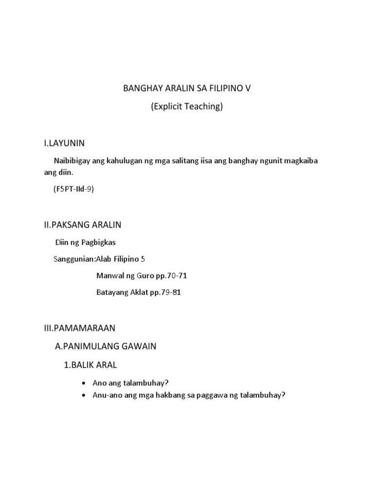 Kahalagahan Mahalaga ang Banghay Aralin dahil dito itinatalaga ang mga impormasyon na kinakailangan ipabatid o ibahagi sa mga mag-aral at ng saganon ay mas maging maganda at presentable ang pagpapahayag o pagtuturo Uri ng. Banghay Aralin sa Araling Panlipunan 10 La Arnie Laurente Pamantayang Nilalaman. Filipino TG F5PN-IIa-12 salaysay ing isang.