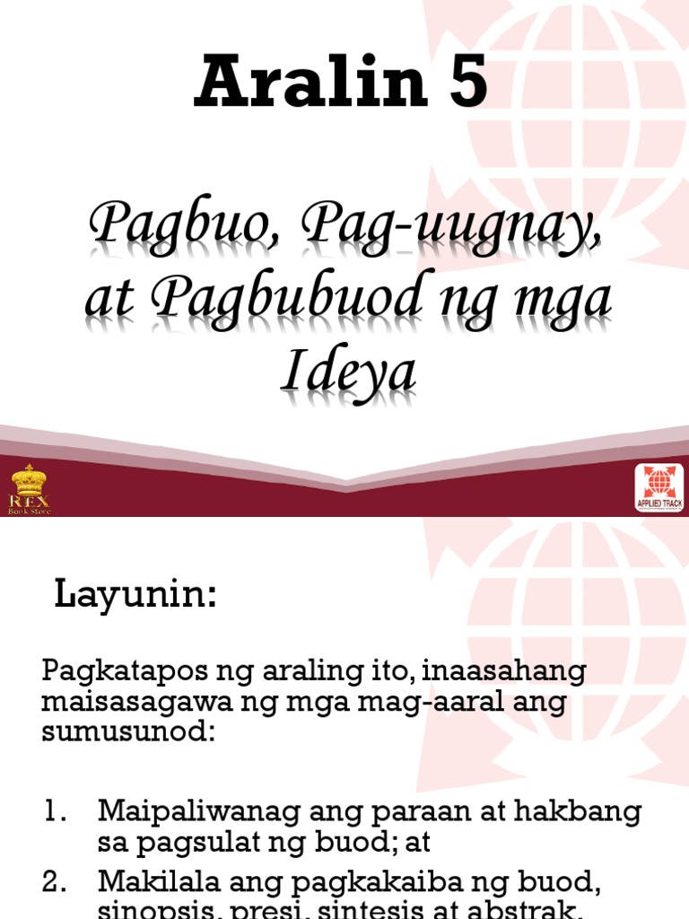 Hakbang Bahagi 1 ng 3. PAANO GUMAWA NG BUOD Ang pagsusulat ng buod ay mahirap gawin sa simula pero kailangan lamang ng kaunting pagsasanay. Pagsulat F7PU-If-g-4 Nabubuo ang ladder organizer upang maisalaysay ng maayos ang pagkakasunod-sunod ng.